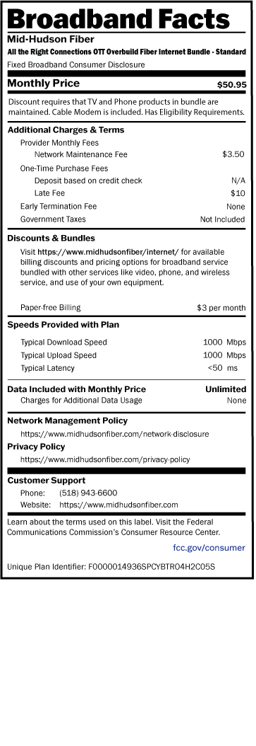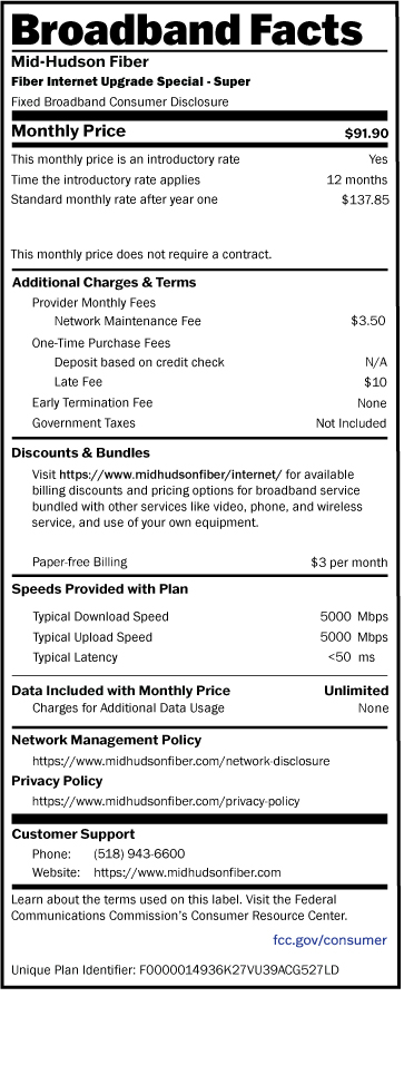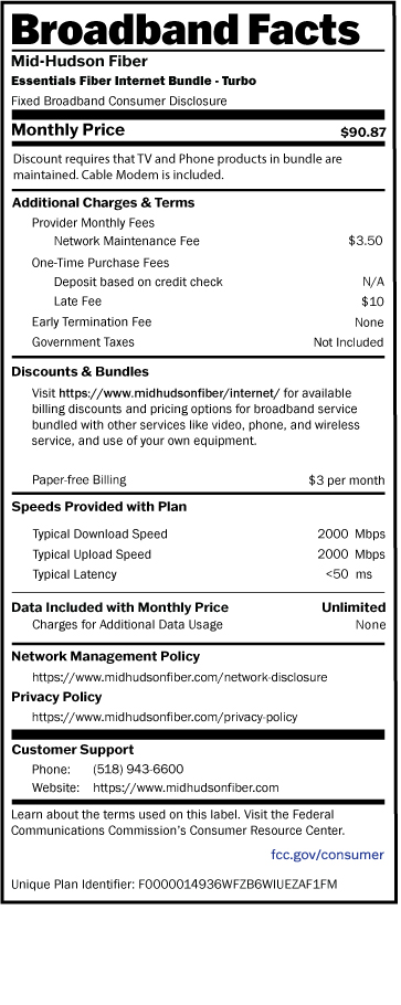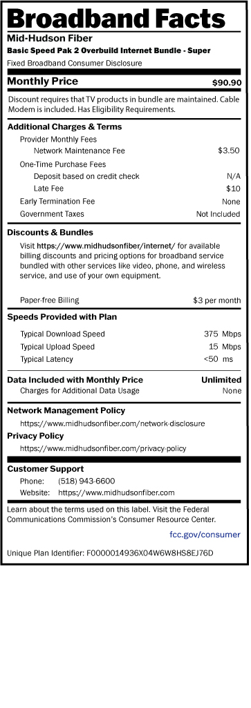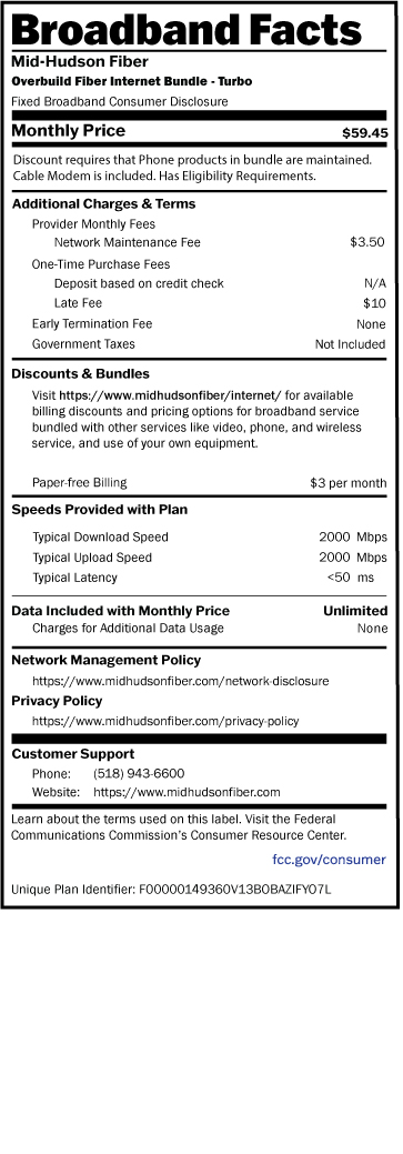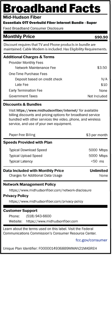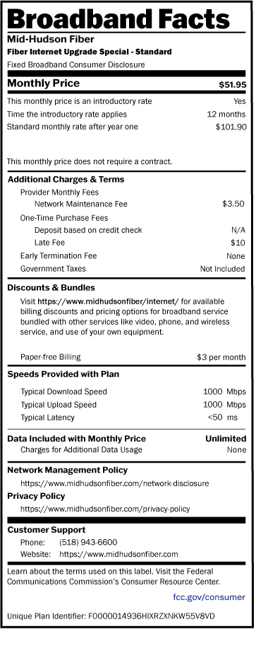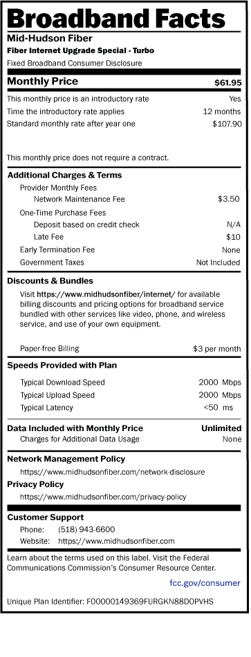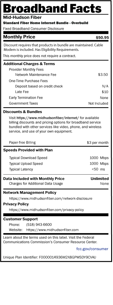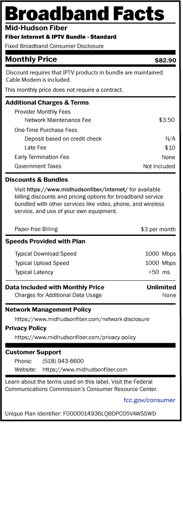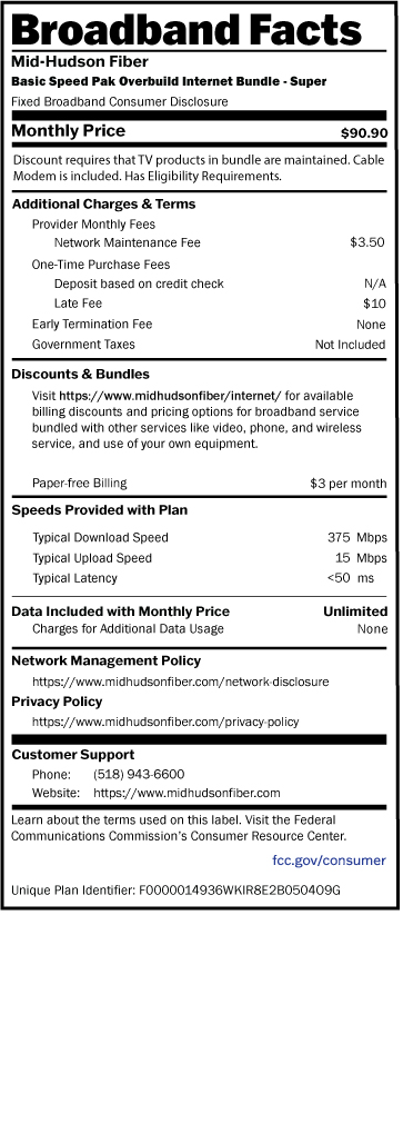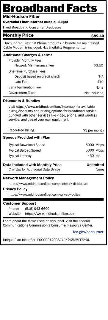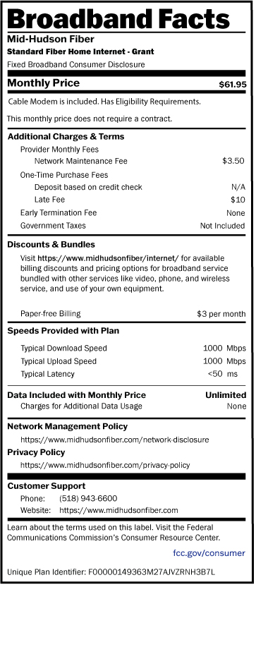 Mid-Hudson Fiber delivers reliable, high-speed internet that our customers depend on. The following labels are designed to clearly and easily show you the pricing, value, and features included in our broadband products. Download the machine readable broadband labels.