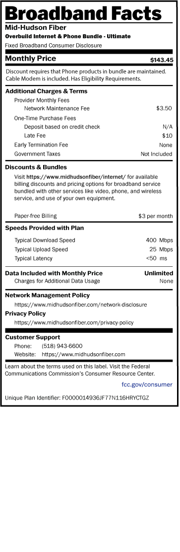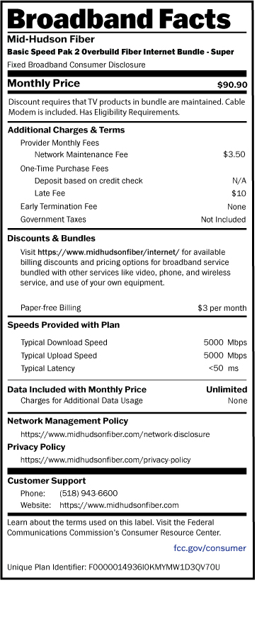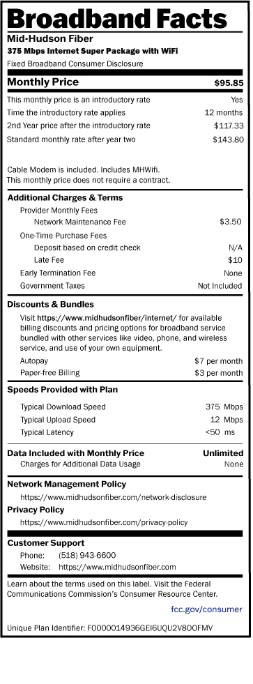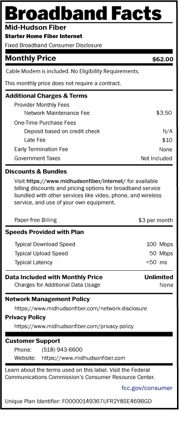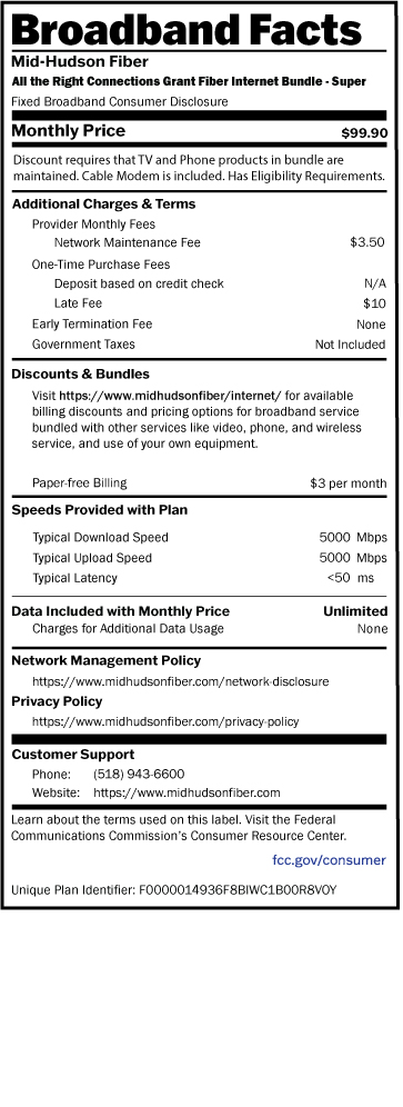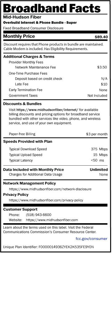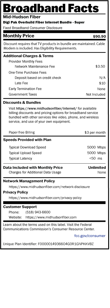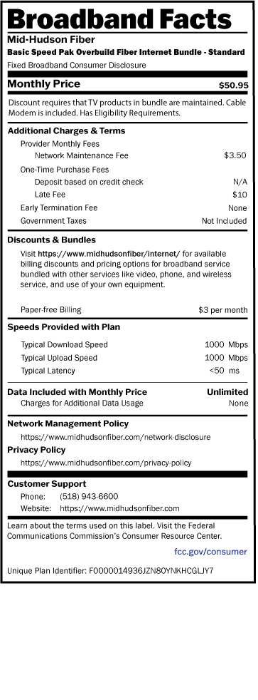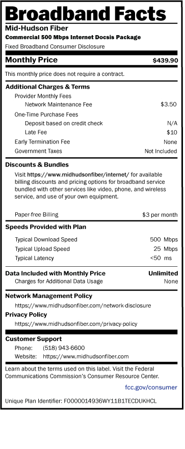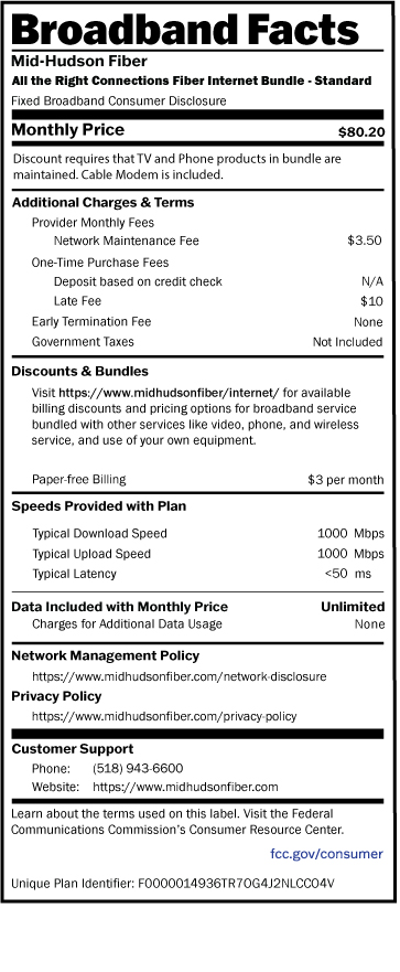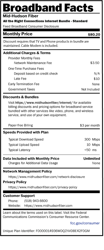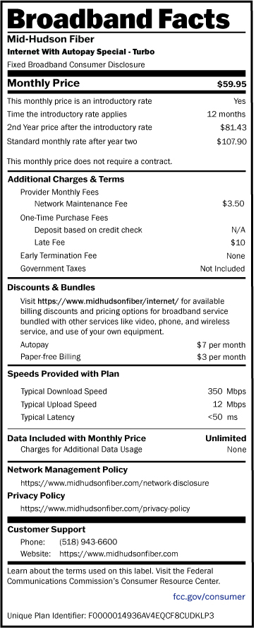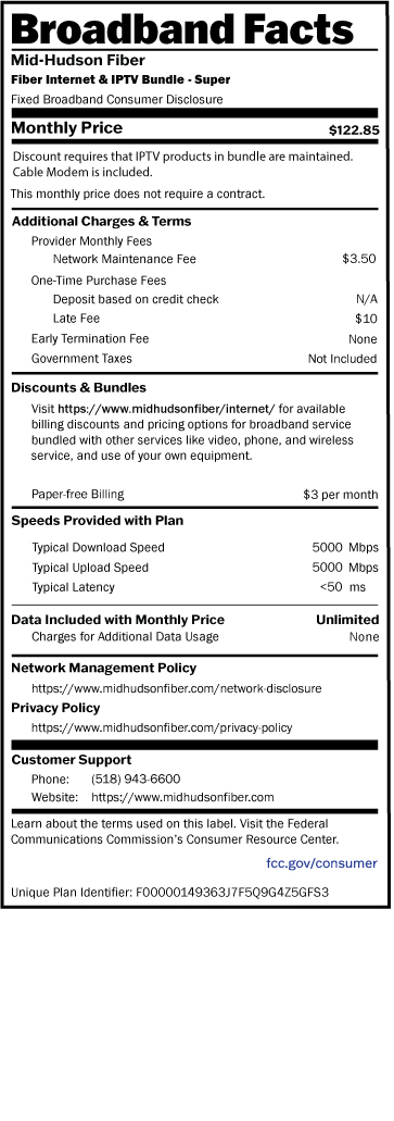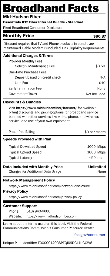 Mid-Hudson Fiber delivers reliable, high-speed internet that our customers depend on. The following labels are designed to clearly and easily show you the pricing, value, and features included in our broadband products. Download the machine readable broadband labels.