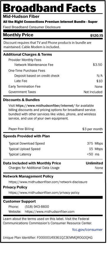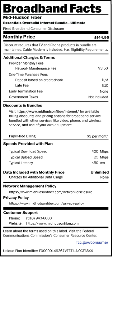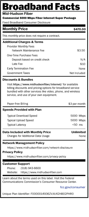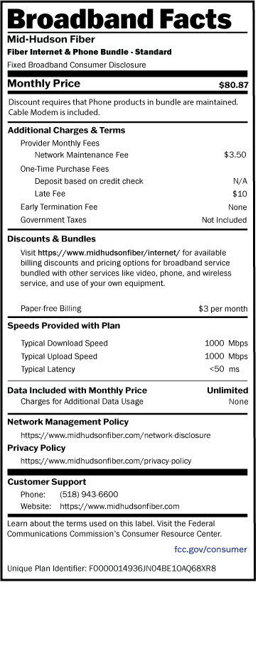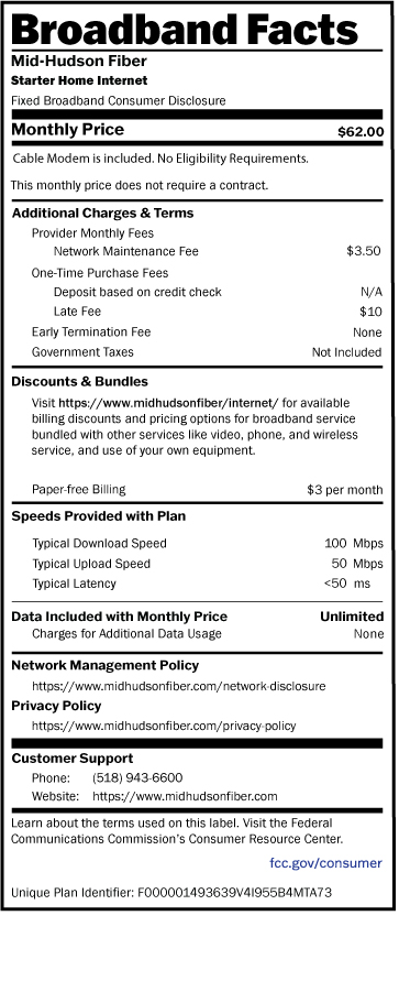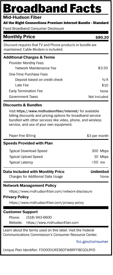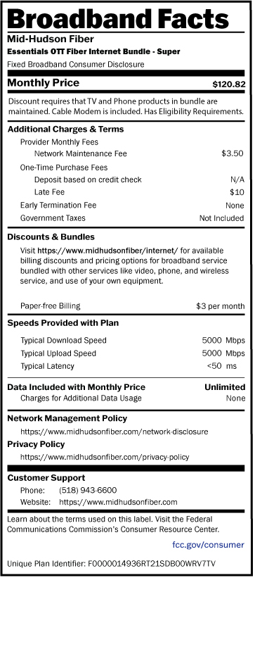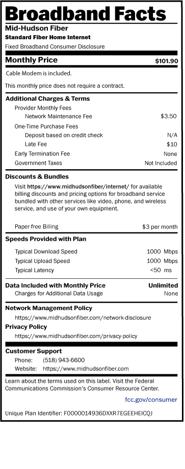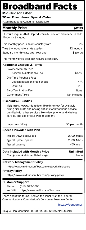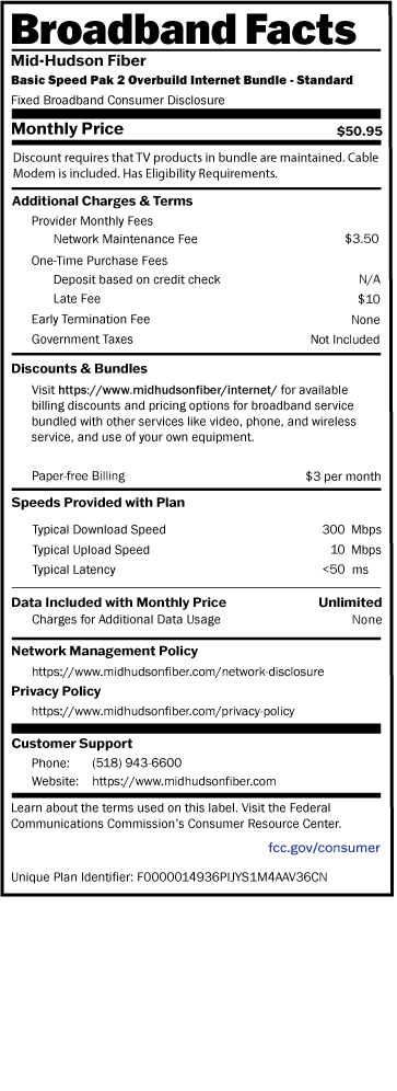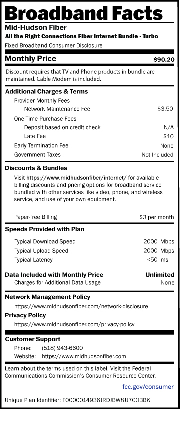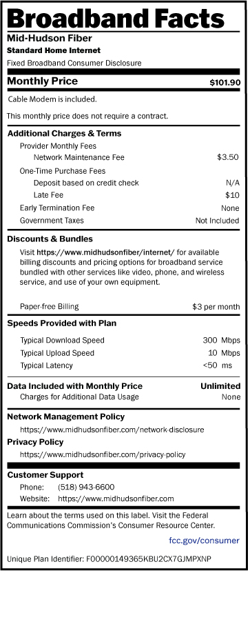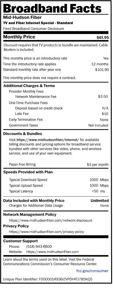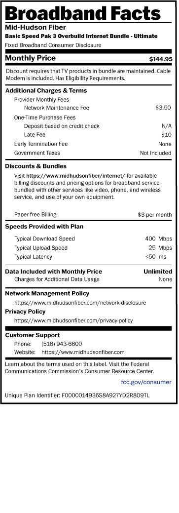 Mid-Hudson Fiber delivers reliable, high-speed internet that our customers depend on. The following labels are designed to clearly and easily show you the pricing, value, and features included in our broadband products. Download the machine readable broadband labels.