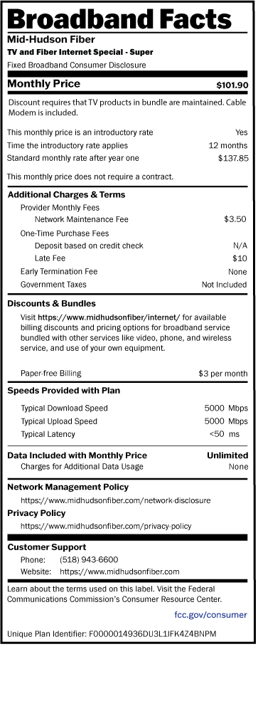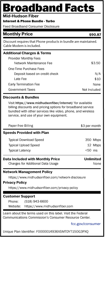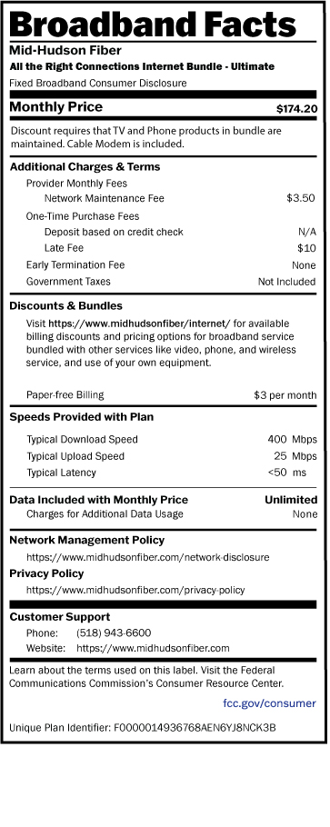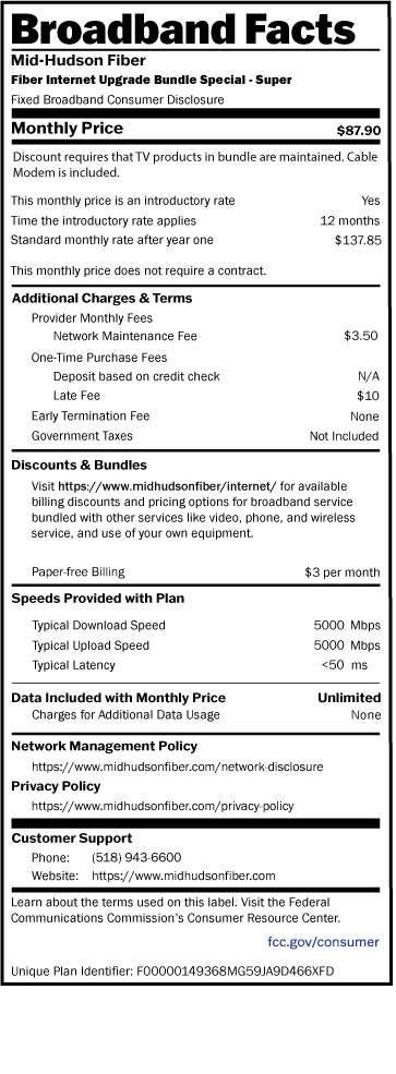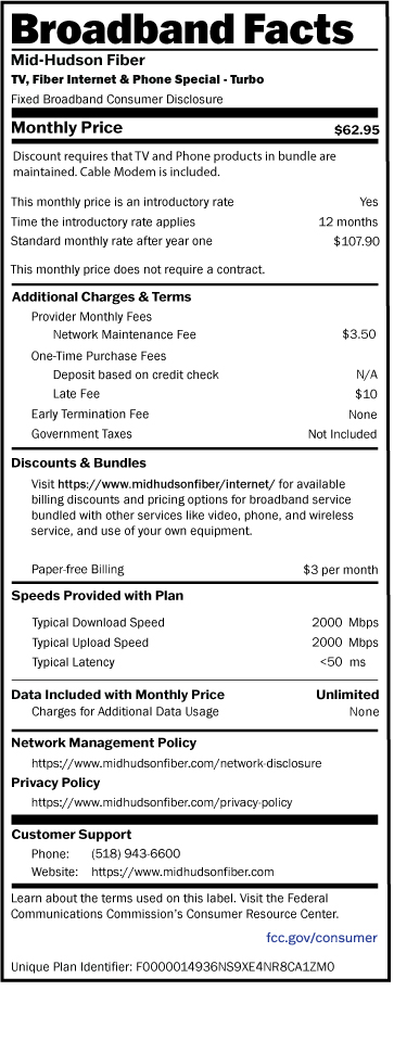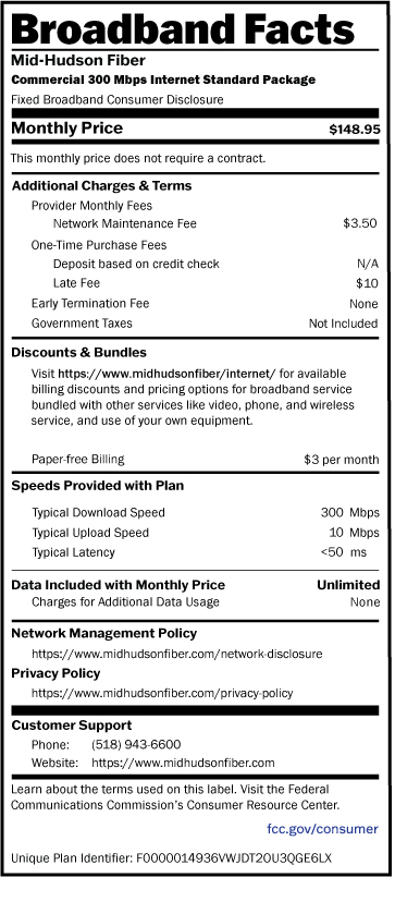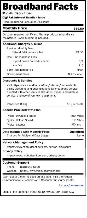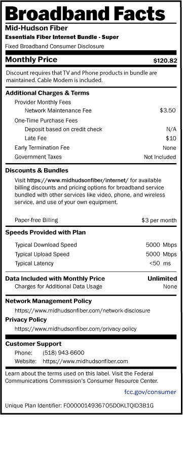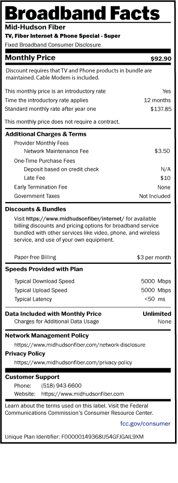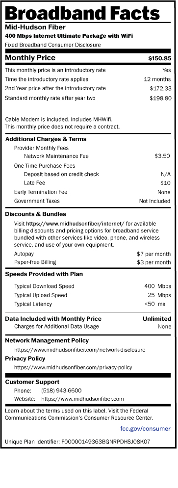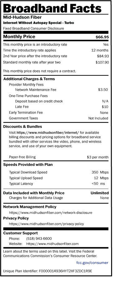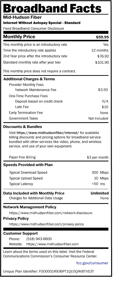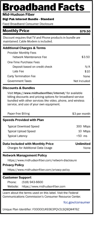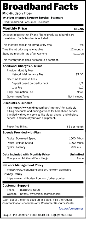 Mid-Hudson Fiber delivers reliable, high-speed internet that our customers depend on. The following labels are designed to clearly and easily show you the pricing, value, and features included in our broadband products. Download the machine readable broadband labels.